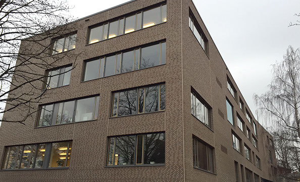 Herstellung und Montage von Holz-Aluminium P/R Fassaden mit Aluminiumeinsatzelementen, Außenraffstore und Aluminiumfenster- und Türen.